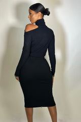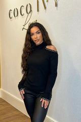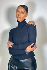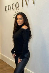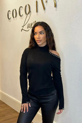 Stay trendy and chic with the MACIE JUMPER. This black knitted jumper features stylish cut out shoulder details with ring accents. Elevate your wardrobe with this must-have jumper that effortlessly combines fashion and comfort.