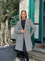 The CHENELLE COAT is a classic long coat with a black and white dogtooth print. It features gold button detail and pockets for convenience. This coat offers timeless style and sophistication, perfect for all occasions.