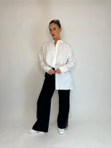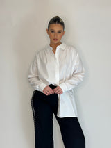 This elegant white KIM Shirt is crafted with hidden buttons and a fashionable pleated detail on the back. Its oversized design really makes it stand out. Perfect for any occasion.