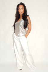 Introducing the SOPHIA TOP, a must-have for any fashion-forward individual. Made with metallic luxe fabric, this sleeveless top exudes chic elegance and is perfect for those summer nights out. Upgrade your wardrobe and make a statement with the SOPHIA TOP.