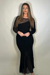 "The RILEY DRESS is a sophisticated and versatile black maxi dress. Perfect for evening wear, this dress features sheer panels and long sleeves, adding a touch of elegance to any occasion. With a timeless design, this dress will never go out of style."